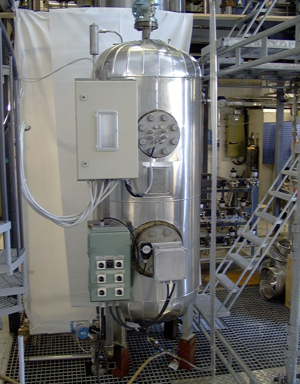 KEKO facility consisted of a large pressure vessel, piping and valves, heating assembly and measurement instrumentation. The pressure vessel was the accumulator 2 of the PACTEL facility with volume of 0,6 m³, inner diameter of 660 mm and height of 1930 mm. Measurement instrumentation was installed through the upper flange and heating assembly through the lower flange of the vessel. Design value for pressure was 60 bar and for temperature 225 °C. In practice, the temperature limit set the limit for experiment parameters. Since practically no superheated conditions occurred in the KEKO experiments, the pressure ranged only up to 16 bar.