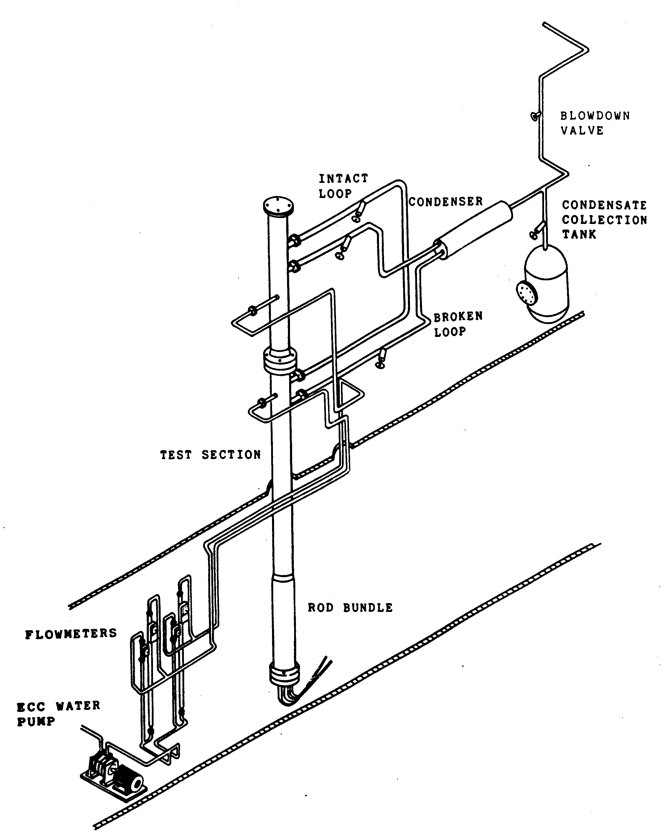 The outer walls of the test section were covered by heating elements to warm up the downcomer before experiments. The test section was thermally isolated. The intact loop was simulated by a stainless steel pipe connecting the upper plenum and the downcomer. The broken loop contained stainless steel pipes from the upper plenum and from the downcomer connected through a condenser to a condensate tank.
