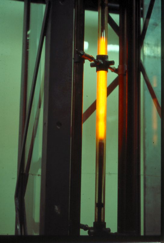 The test section in REWET-I consisted of a directly heated fuel rod simulator (total length 2135 mm, heated length 1550 mm, outer diameter 12.25 mm) surrounded by a quartz glass tube (inner diameter 24.2 mm, thickness of the glass wall 3 mm). Now there are three rods in the core. Due to the glass tube surrounding the rod, the rewetting phenomena can be visualized. The cooling water flows in the annular flow channel between rod and glass.