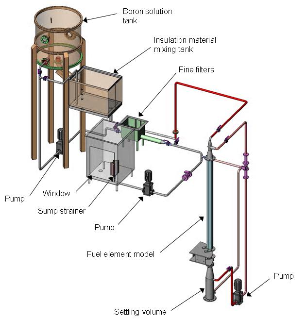 To study filtration capacity of sump strainers of Loviisa VVER-440 NPP, a scaled down test rig was designed and constructed at Lappeenranta University of Technology in 2008. The test rig consists of a boron solution tank (volume 1.35 m³), an insulation material tank (0.8 m³), a sump strainer tank (0.8 m³), a sump strainer, a full-scale VVER-440 fuel assembly model, pumps, fine filters (#0.2 mm), piping (DN40), electric heaters, valves, measurement instrumentation and a data acquisition system. The bottoms and walls of the tanks and the piping are insulated with 50 mm thick mineral wool to reduce heat losses.