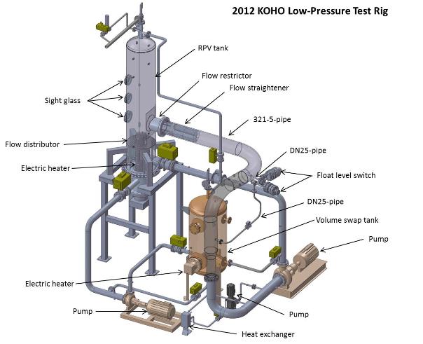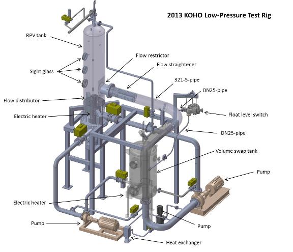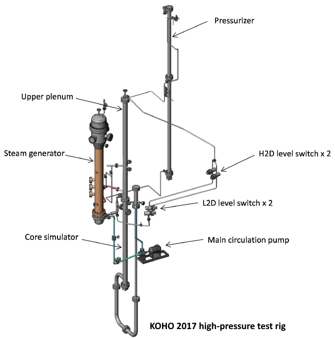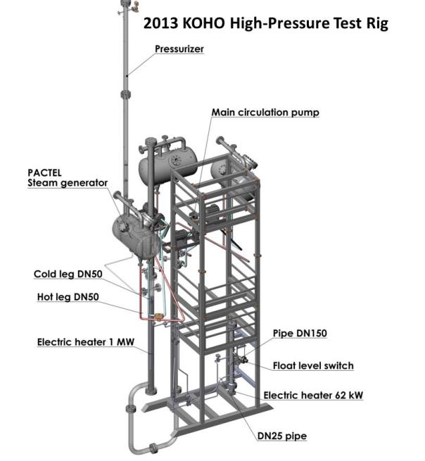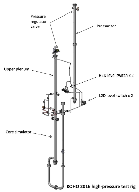 In 2013, also a high-pressure test rig was designed and constructed. The test rig is attached to the DN50 hot leg of the PACTEL test facility. The main components of the high-pressure test rig are: a reactor pressure vessel tank, two float level switches, an electric heater, piping, valves, a non-condensable gas injection system, measurement instrumentation and a data acquisition system. The maximum operating pressure and temperature of the high pressure test rig are 80 bar (abs.) and 300°C, correspondingly.
